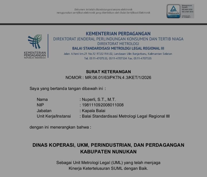 Kepala DKUKMPP Nunukan, Muhtar mengatakan, penilaian dilakukan oleh Balai Standardisasi Metrologi Legal Regional III Banjarbaru dan hasilnya disampaikan melalui surat tertanggal 14 Januari 2026 Nomor MR.06.01/62/PKTN.4.3/SD/1/2026 tentang Penyampaian Surat Keterangan Penilaian Kinerja Ketertelusuran SUML.