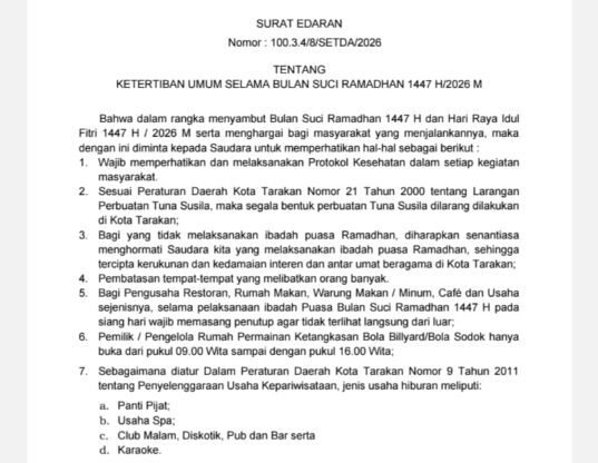 benuanta.co.id, TARAKAN – Pemerintah Kota (Pemkot) Tarakan menerbitkan Surat Edaran (SE) tentang Ketertiban Umum Selama Bulan Suci Ramadan 1447 Hijriah/2026 Masehi.