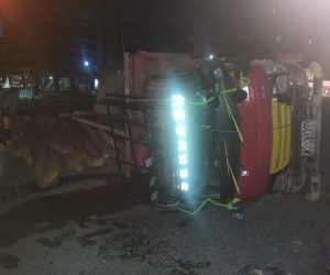 Nyaris Hangus, Dump Truck Angkut Kayu Olahan Terbalik Dekat GTM