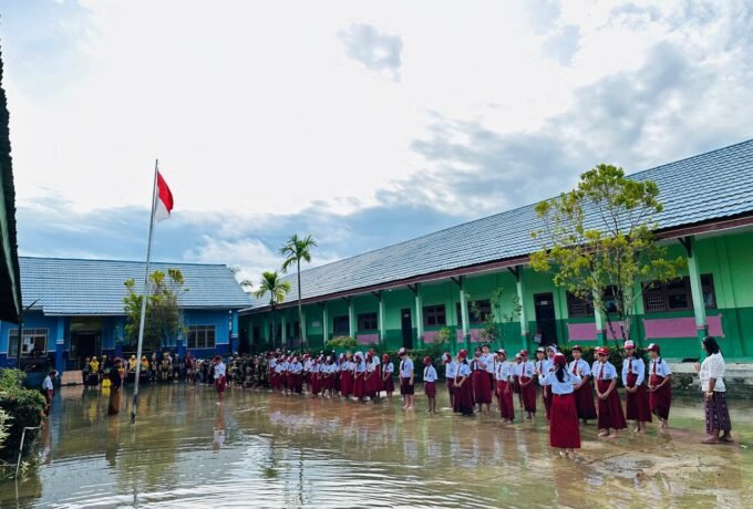 Pelajar SDN 001 Malinau Utara Tetap Semangat Laksanakan Upacara HUT RI di Tengah Banjir