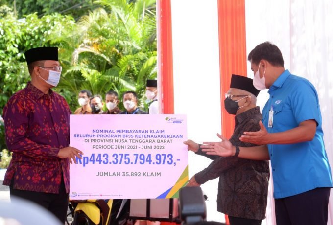Mataram – Wakil Presiden Ma’ruf Amin menyerahkan santunan program BPJS Ketenagakerjaan (BPJAMSOSTEK)