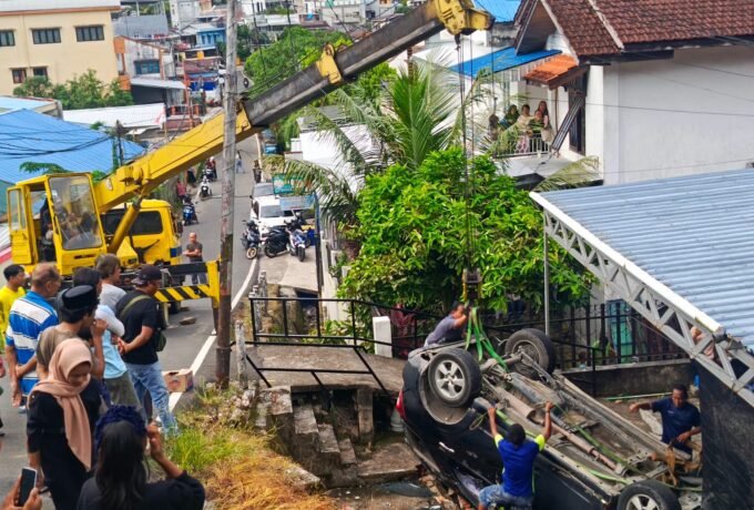 Minibus Pelat Merah Milik RSUKT Terjun Bebas dan Terbalik di Pekarangan Rumah Warga