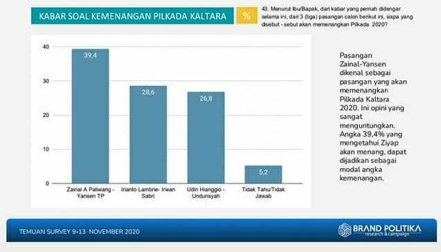 Politisi Partai Gerindra ini merincikan, hasil survei juga menunjukkan bahwa 39,4 persen masyarakat Kaltara yakin Zainal-Yansen akan memenangkan pesta demokrasi yang digelar pada 9 Desember 2020 mendatang. Sedangkan pasangan Irianto-Irwan berada diurutan kedua dengan 28,6 persen, dan 26,8 persen untuk pasangan Udin-Undun.