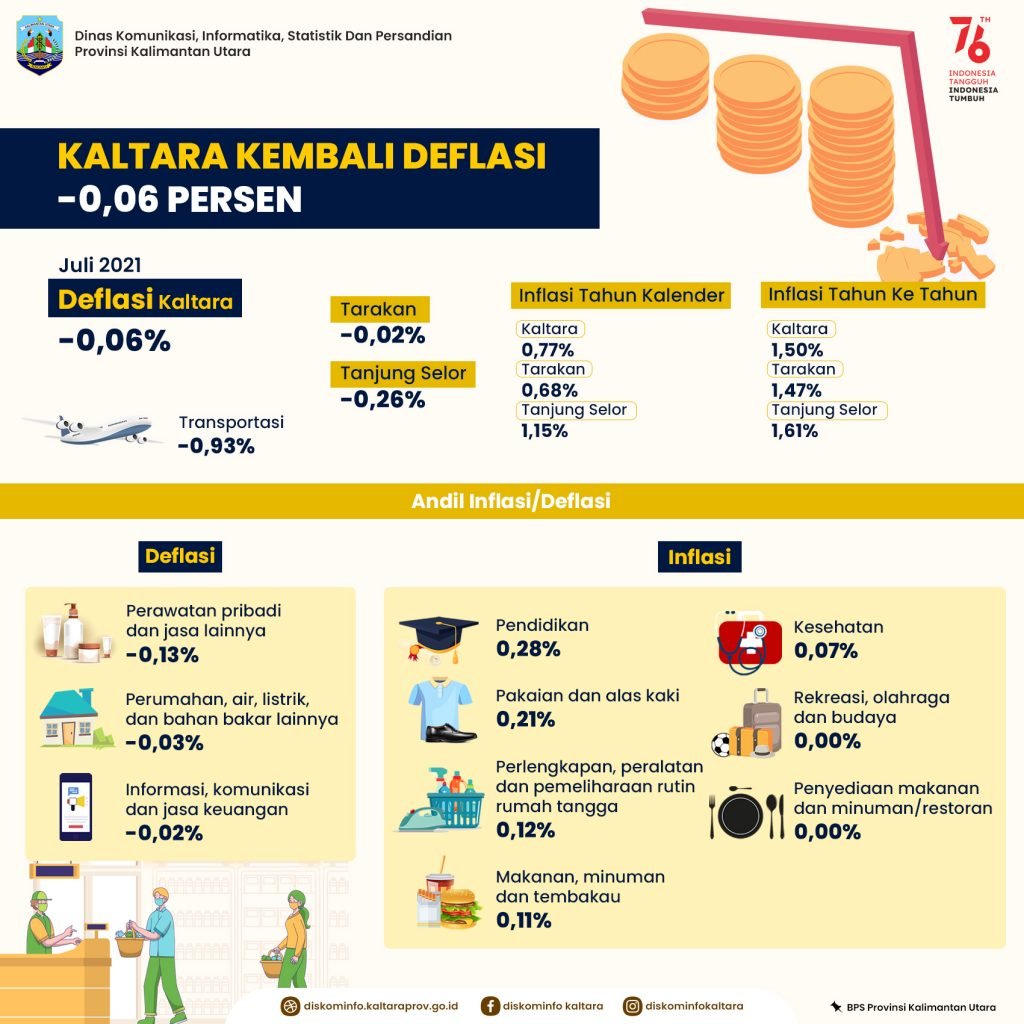 Deflasi yang terjadi sebagai akibat dari adanya kelompok pengeluaran dari tingkat inflasi bulanan mengalami penurunan. Kelompok pengeluaran tersebut adalah transportasi dimana Indeks harga konsumen pada Bulan Juli 2021 mengalami penurunan sebesar -0,93 persen. Selain Provinsi Kaltara, Kota Tarakan juga mengalami deflasi sebesar -0,2 persen dan Tanjung Selor sebesar -0,26 persen.