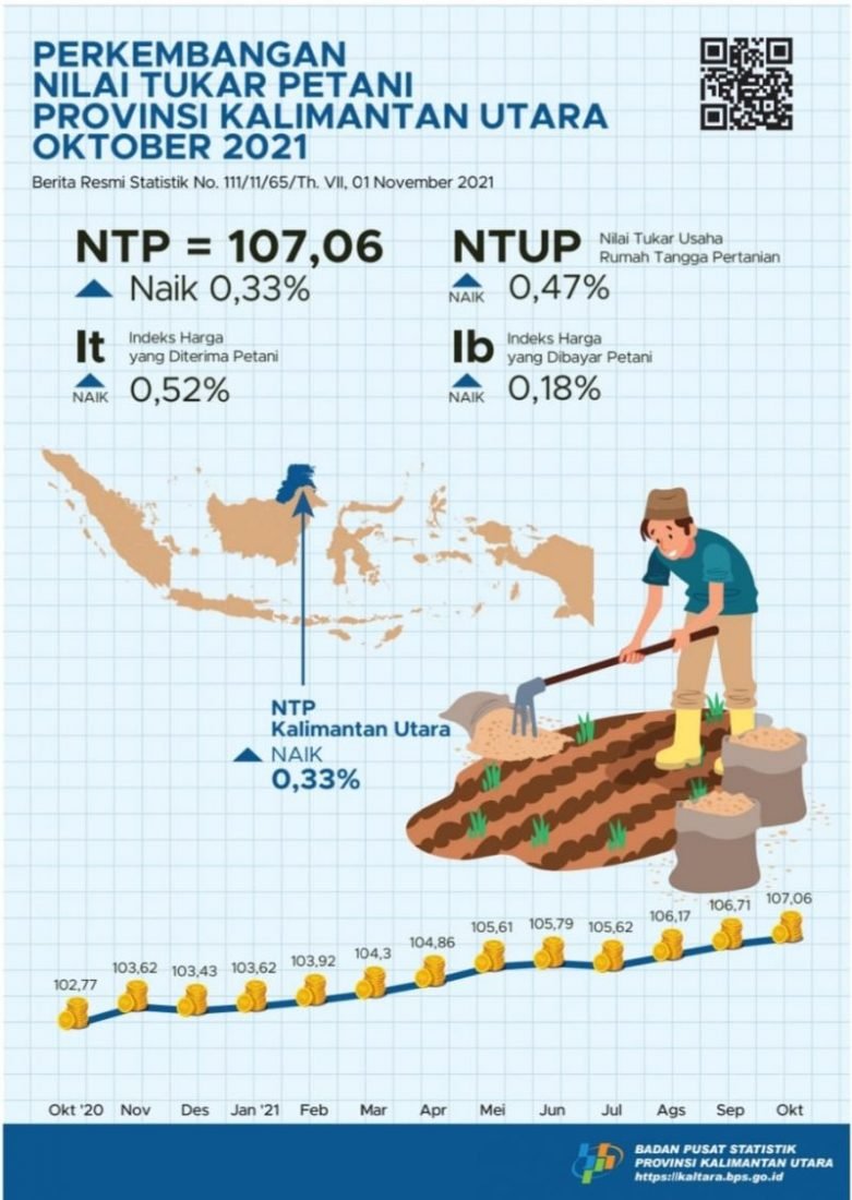 Kepala Badan Pusat Statistik (BPS) Kaltara, Tina Wahyufitri, S.Si., M.Si menerangkan pada Oktober 2021 NTP Kaltara sebesar 107,06. Hal itu disebabkan oleh beberapa faktor diantaranya Indeks Harga yang diterima petani.