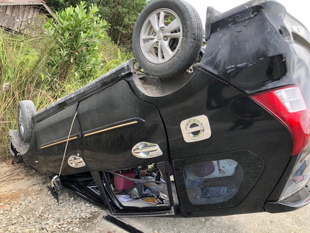 “Saat melintas, tiba-tiba setir mobil terkunci sehingga pengemudi membanting setir ke kanan lalu mobil terus melaju ke jalur kanan hingga terbalik sebanyak 3 kali. Akibat laka lantas yang terjadi pukul 12.00 Wita itu, pengemudi mengalami luka sobek di kepala bagian atas dan mendapat tujuh jahitan, dua penumpang lainnya bernama Anggrino Gilang (24), Iwan Supriadi Bani (23) mengalami nyeri di bagian punggung dan bagian kepala. Sementara dua penumpang bernama Nur Gusti (31) dan Berky Rian (30) dalam keadaan sehat. Mereka telah dibawa ke Puskesmas Desa Pimping untuk menjalani penanganan medis,” ungkapnya.