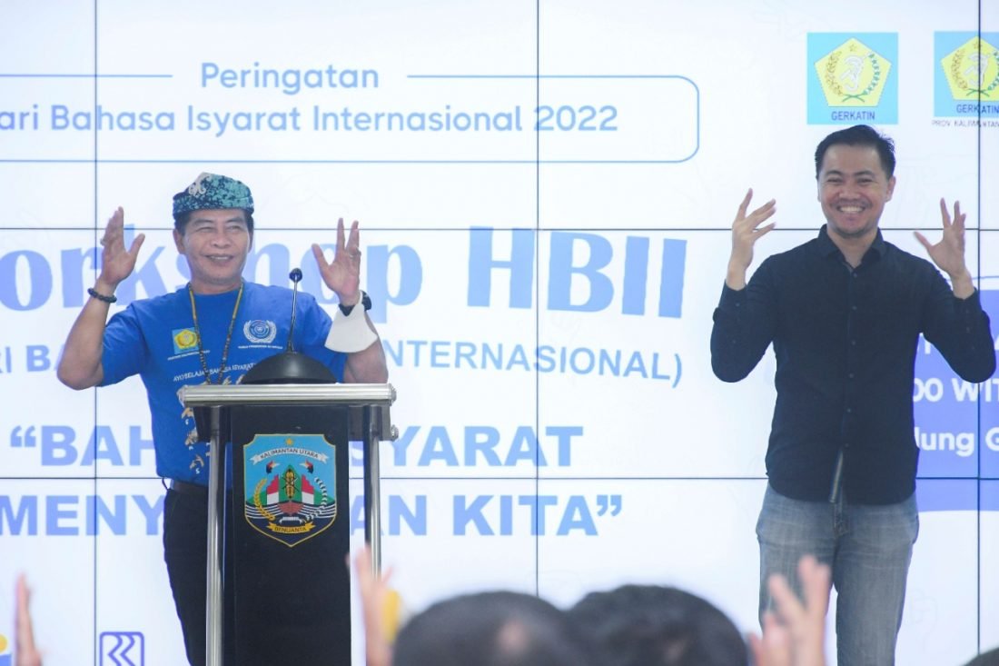 TANJUNG SELOR – Gubernur Kalimantan Utara (Kaltara) Drs H. Zainal A Paliwang SH, M.hum., menghadiri Hari Bahasa Isyarat Internasional (HBII) 2022 yang diselenggarakan Dewan Pimpinan Daerah (DPD) Gerakan untuk Kesejahteraan Tunarungu Indonesia (Gerkatin) Kaltara di Gedung Gabungan Dinas, Pemprov Kaltara, Sabtu (24/09/2022).