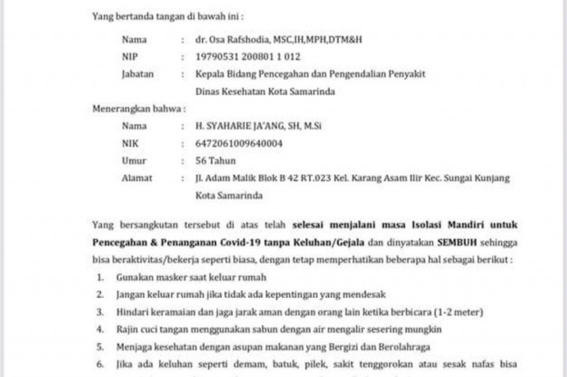 Samarinda – Wali Kota Samarinda Syaharie Jaang dinyatakan sembuh dari COVID-19, setelah sempat menjalani isolasi mandiri selama beberapa hari di rumah dinas.