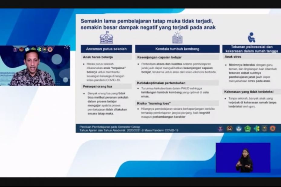 “Pembelajaran tatap muka hanya dapat dilakukan di sekolah yang memenuhi daftar isian ini. Ada enam daftar ini, sama seperti SKB sebelumnya,” ujar Nadiem dalam Pengumuman Penyelenggaraan Pembelajaran Semester Genap TA 2020/2021 di Masa Pandemi COVID-19 di Jakarta, Jumat.