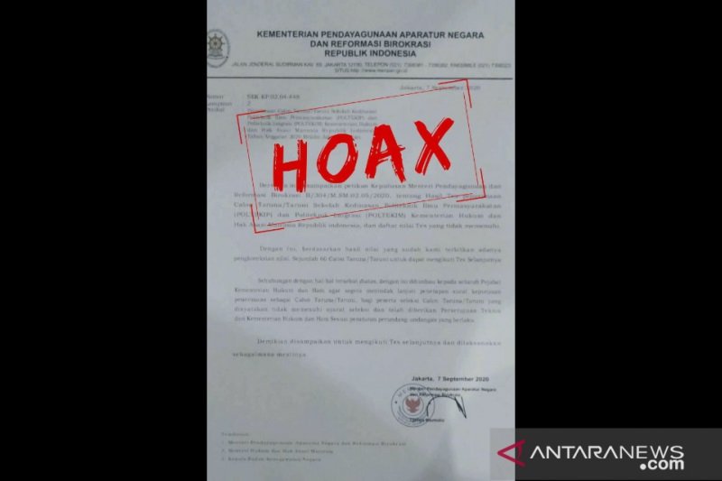 “Kami tegaskan surat tersebut adalah palsu atau hoaks. Menteri PAN-RB tidak pernah mengeluarkan surat tersebut,” ujar Kepala Biro Hukum, Komunikasi, dan Informasi Publik Kementerian PAN-RB Andi Rahadian dalam pesan singkat yang diterima di Jakarta, Rabu.
