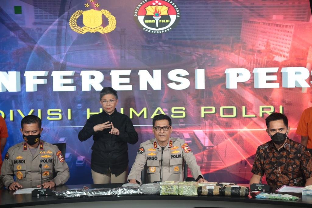 JAKARTA- Ada pemandagan berbeda diacara konferensi pers pengungkapan kasus narkotika jaringan internasional yang digelar Divisi Humas Mabes Polri, Jumat (29/1/2021).