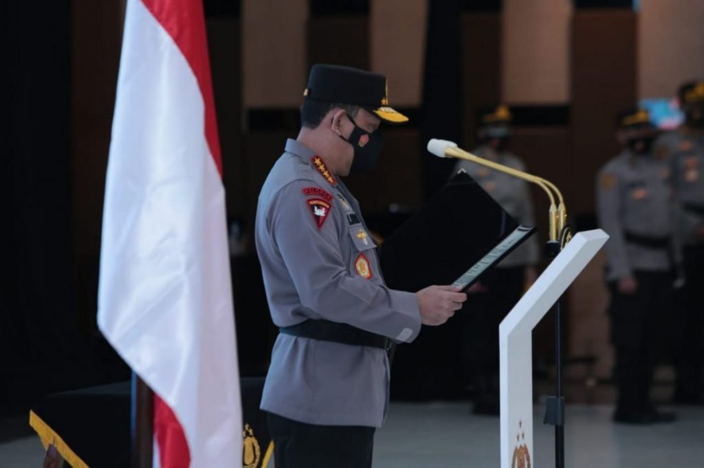 “Bahwa saya, akan setia kepada Negara Kesatuan Republik Indonesia yang berdasarkan Pancasila dan UUD tahun 1945 serta akan menjalankan segala peraturan perundang-undangan,” kata Kapolri yang diikuti oleh seluruh pejabat utama Mabes Polri, Rabu (24/2/2021).