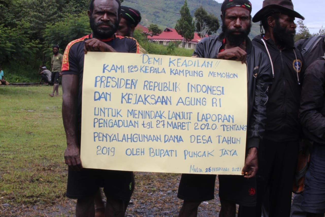 “Demi Keadilan, kami 125 Kepala Kampung memohon Presiden Republik Indonesia dan Kejaksaan Agung Republik Indonesia segera menindaklanjuti laporan pengaduan Tanggal 27 Maret 2020 tentang penyalahgunaan dana desa tahun 2019 oleh Bupati Puncak Jaya,”tulis warga dalam posternya.
