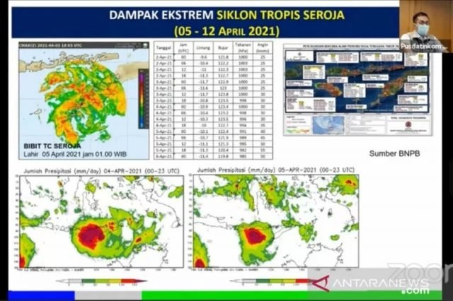 “Secara kesimpulan, Siklon Tropis Seroja memang kedua terkuat sejak 2008, setelah Siklon Tropis Kenanga di selatan Jawa,” ujar Koordinator Bidang Prediksi dan Peringatan Dini Cuaca Miing Saepudin dalam diskusi daring Bencana Hidrometeorologi NTT akibat Siklon Seroja yang dipantau dari Jakarta, Kamis.