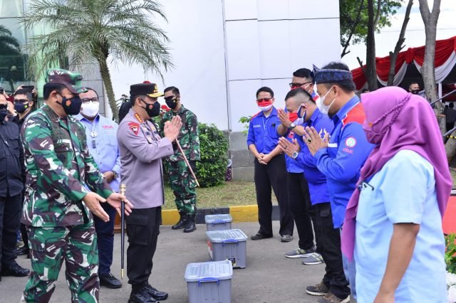 JAKARTA – Panglima TNI Marsekal Hadi Tjahjanto dan Kapolri Jenderal Listyo Sigit Prabowo meninjau pelaksanaan vaksinasi massal Konfederasi Serikat Pekerja Seluruh Indonesia (KSPSI) di PT. Kahatex, Sumedang, Jawa Barat, Kamis (5/8/2021).