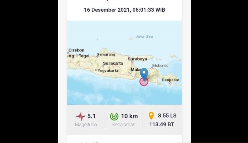 Magnitudo awal menunjukkan kekuatan gempa 5,1 kemudian diperbarui menjadi 5,0.