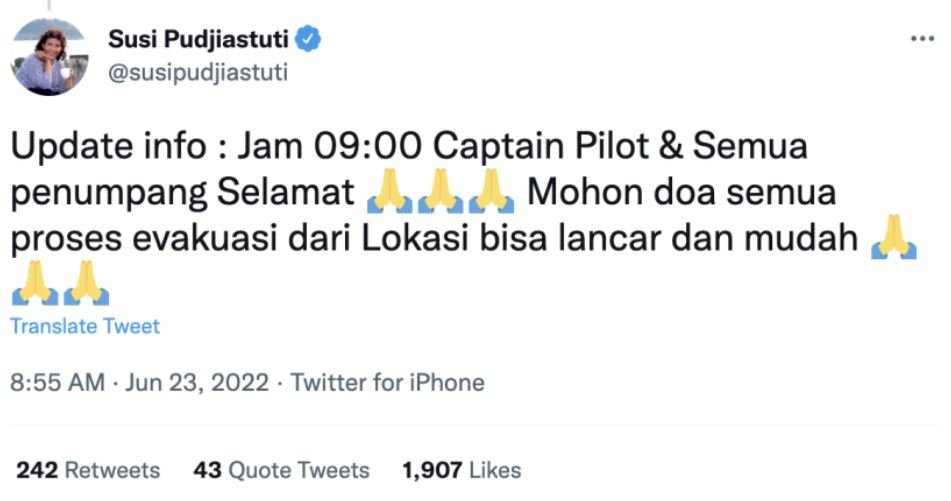 Cuitan tersebut ia unggah setelah mengabarkan berita duka terkait pesawat Susi Air yang mengalami kecelakaan di rute Timika-Duma dengan jumlah penumpang sebanyak enam orang.
