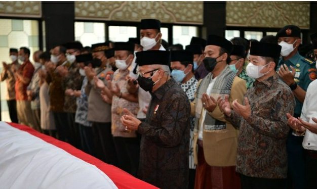 Jakarta – Wakil Presiden Ma’ruf Amin memimpin salat jenazah Menteri Pendayagunaan Aparatur Negara dan Reformasi Birokrasi (Menpan RB) Tjahjo Kumolo di Masjid Quba, Gedung Kemenpan RB, Jakarta, Jumat.