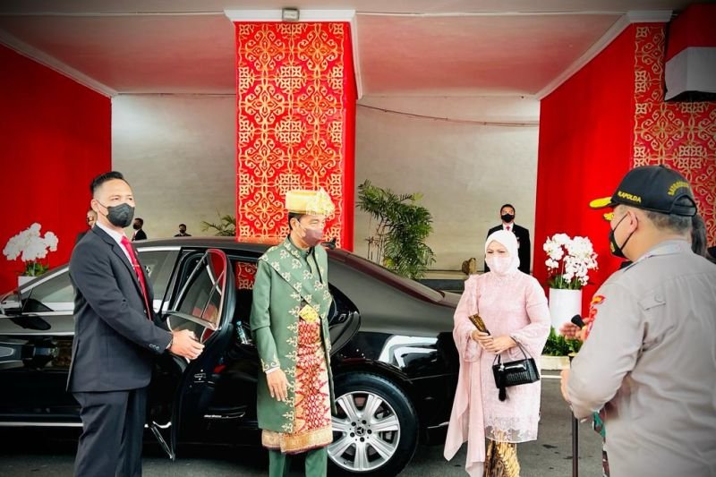 Jakarta – Presiden Joko Widodo mengenakan baju adat Bangka Belitung warna hijau bermotif pucuk rebung saat menghadiri Sidang Tahunan MPR-RI dan Sidang Bersama DPR RI dan DPD RI Tahun 2022 di Jakarta, Selasa.