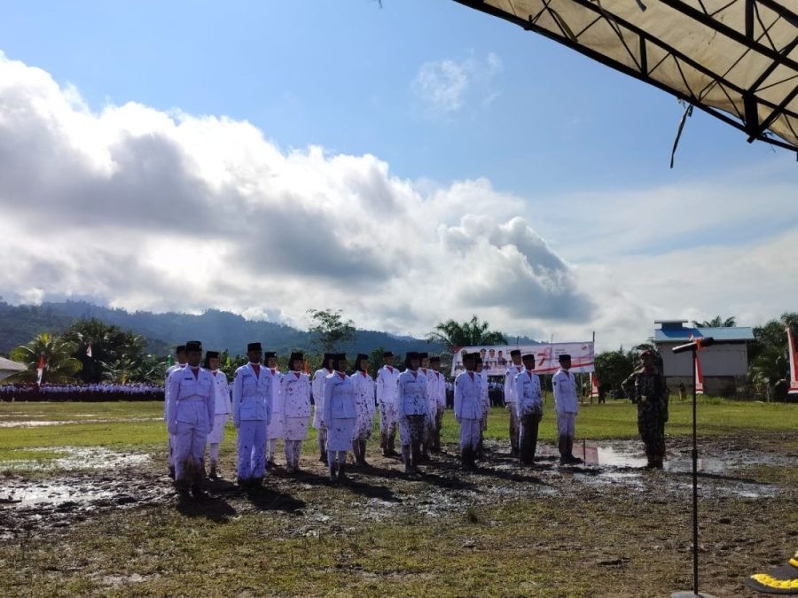 benuanta.co.id, NUNUKAN – Perjuangan demi kibarkan bendera merah putih, puluhan pelajar Sekolah Menengah Atas (SMA) di Desa Bambangan, Kecamatan Sebatik Barat yang bertugas sebagai Pasukan pengibar bendera (Paskibra), tetap semangat meski lapangan upacara digenangi kubangan lumpur, Kamis, 17 Agustus 2023.