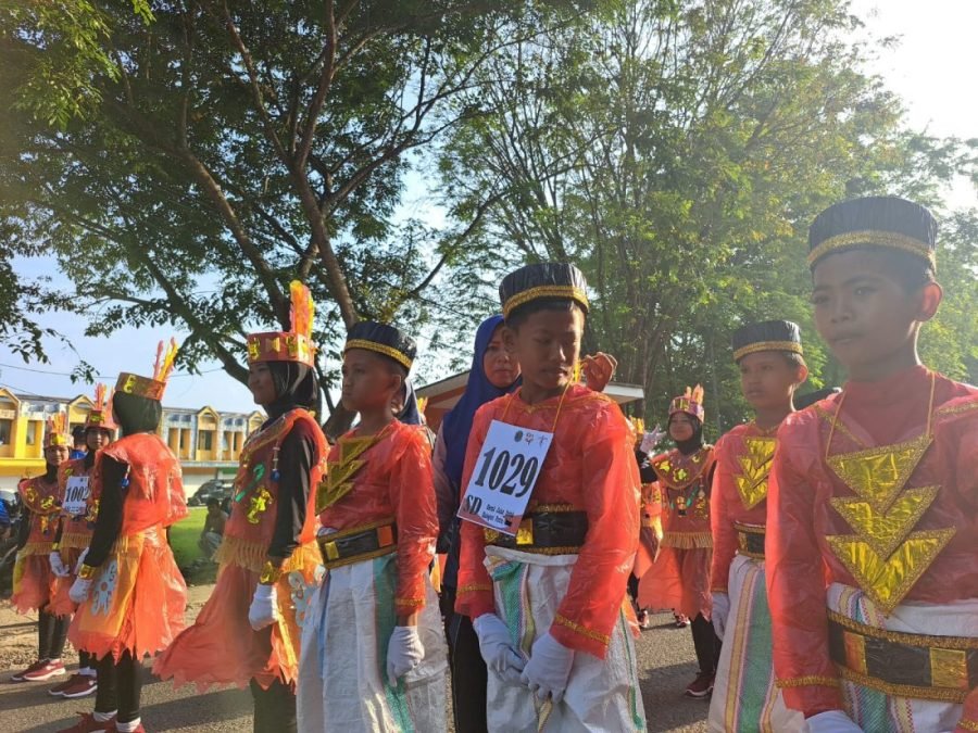 “Kami mengambil nuansa khas Dayak nuansanya merah dan kuning yang digunakan oleh siswi perempuan dan juga laki menggunakan pakaian plastik batu Bugis namun menggunakan sarung dari karung,” terangnya.