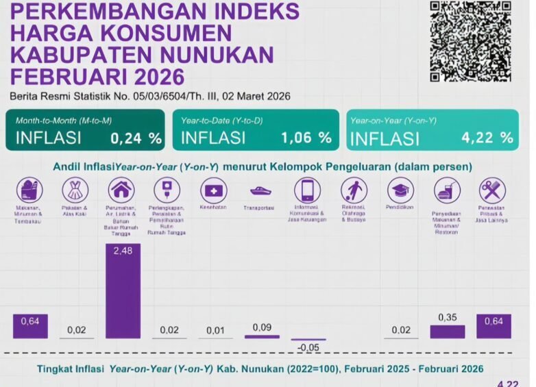 benuanta.co.id, NUNUKAN– Badan Pusat Statistik Kabupaten Nunukan mencatat Inflasi Kabupaten Nunukan pada Februari 2026 sebesar 4,22 persen secara tahunan, dengan laju bulanan yang relatif terkendali di angka 0,25 persen.