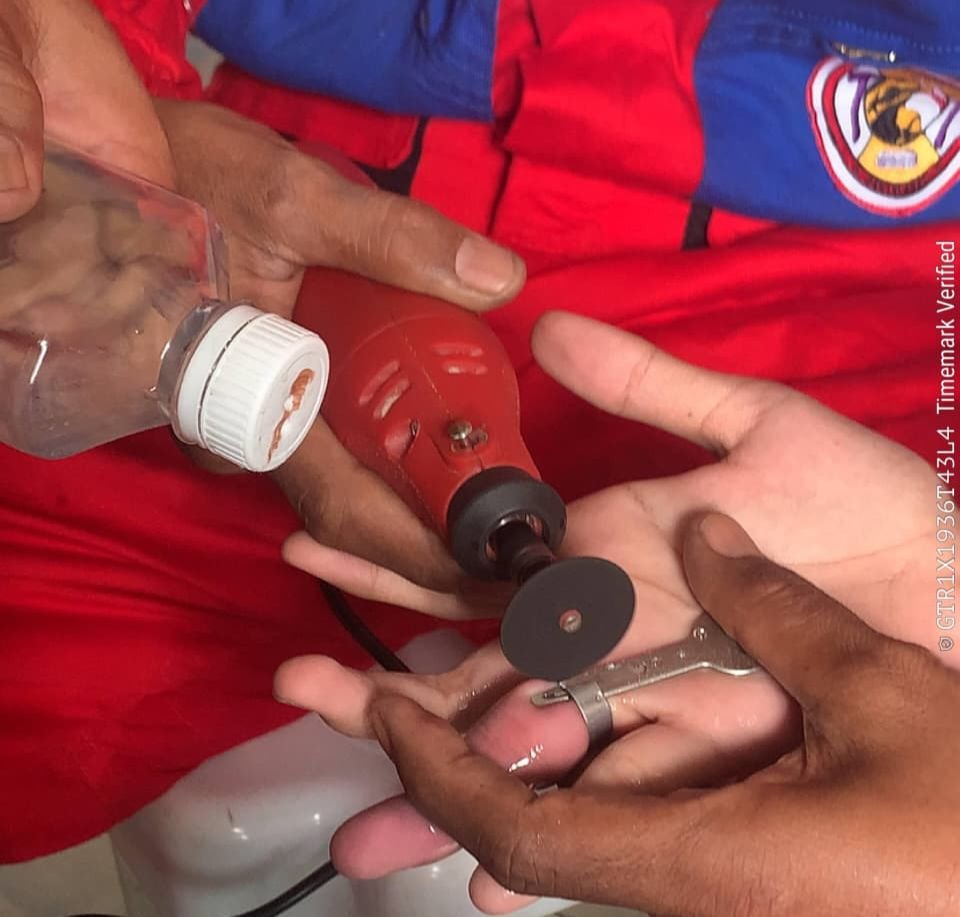 “Kami mendengarkan keluhannya terlebih dahulu sembari memperhatikan dan mempelajari evakuasi yang tepat untuk pelepasan cincin, akhirnya diputuskan untuk menggunakan mesin gerinda mini, karena kondisi jari sudah mengalami pembengkakan,” ungkapnya.