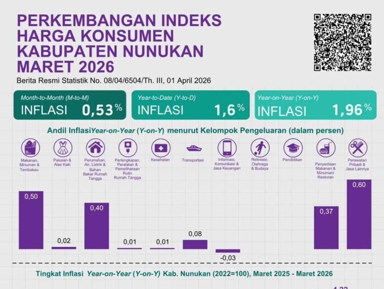 “Inflasi Kabupaten Nunukan pada Maret 2026 masih relatif rendah dan terkendali. Ini menunjukkan stabilitas harga di daerah tetap terjaga, meskipun terdapat kenaikan pada beberapa kelompok pengeluaran,” ujar ungkapnya.