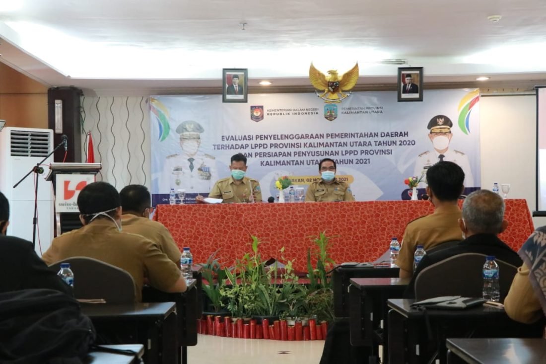TARAKAN – Meningkatkan penyelenggaraan pemerintahan di lingkungan Pemerintah Provinsi (Pemprov) Kalimantan Utara (Kaltara), Biro Pemerintahan dan Otonomi Daerah Kaltara menggelar Evaluasi Penyelenggaraan Pemerintahan Daerah terhadap Laporan Penyelenggaraan Pemerintahan Daerah (LPPD) Provinsi Kaltara tahun 2020, di Hotel Swissbell, Kota Tarakan pada Selasa, 2 November 2021.