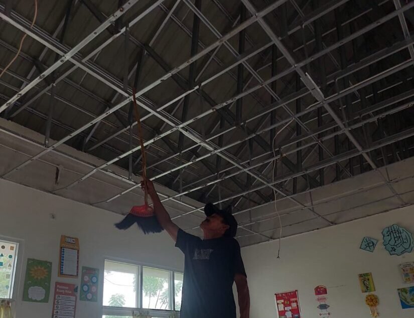 “Kondisi mengkhawatirkan. Plafon ruang kelas VI A dan VI B sudah runtuh, sementara itu enam ruang kelas lain juga rusak parah akibat kebocoran,” ungkapnya.