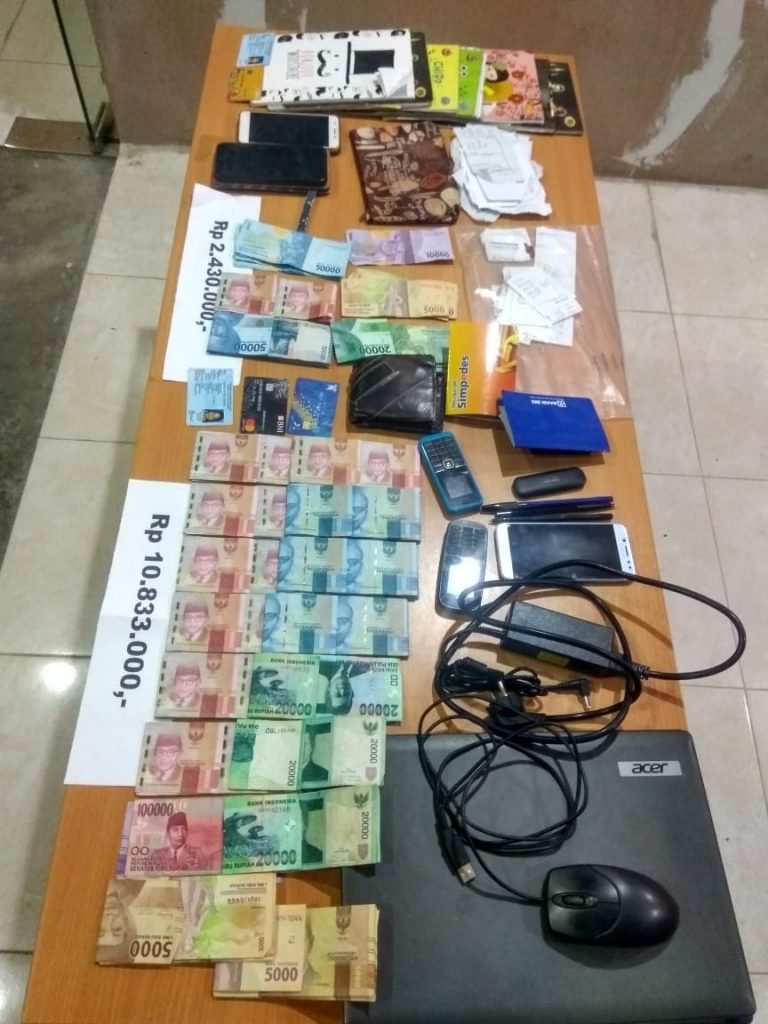 Barang Bukti yang diamankan uang tunai hasil togel Rp 10.833.000, HP Nokia warna biru dan HP Nokia warna hitam, HP Samsung J7, 1 buah mouse, 1 buah laptop, 1 buah charge laptop dan 1 buah modem.