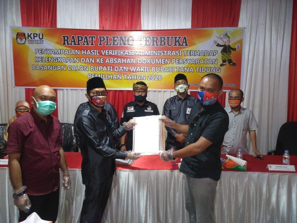 TANA TIDUNG – KPU Tana Tidung secara resmi telah melakukan rapat pleno dan menyerahkan hasil verifikasi administrasi dan hasil pemeriksaan kesehatan para Bakal Calon Bupati dan Bakal Calon Wakil Bupati Tana Tidung. Hasilnya, semuanya telah lengkap dan memenuhi syarat, Ahad (13/9) lalu.