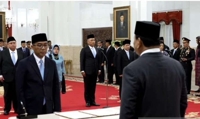 Usai pembacaan keputusan presiden dan daftar nama pejabat yang akan dilantik, Presiden Prabowo membacakan sumpah jabatan yang diikuti para pejabat yang dilantik.