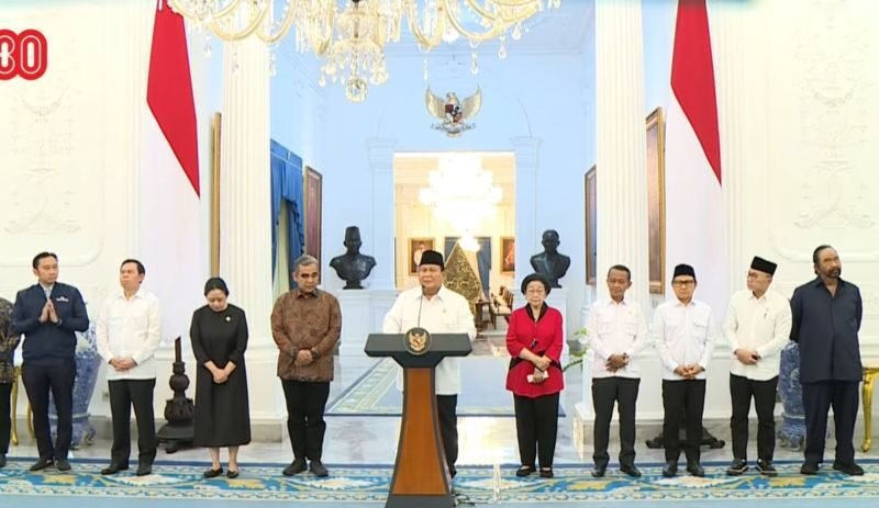 Dalam pernyataan pers tersebut, Prabowo didampingi sejumlah pimpinan lembaga negara dan partai politik, yakni. Presiden ke-5 RI Megawati Soekarnoputri, Ketua MPR RI Ahmad Muzani, Ketua DPR RI Puan Maharani, Ketua DPD RI Sultan Bachtiar Najamuddin.