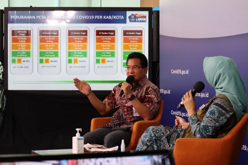 Prof. Wiku juga menjelaskan bahwa persentase daerah di Indonesia dengan risiko peningkatan kasus yang rendah dan tidak berdampak mencapai angka 50 persen. Akan tetapi, perubahan peta zonasi ini terjadi dengan sangat dinamis. Daerah berstatus zona hijau pun sewaktu-waktu dapat berubah menjadi zona kuning, oranye, atau bahkan merah. “Jadi dia harus tetap menjaga, misalnya (daerah) yang tidak pernah terdampak (kasus), jangan sampai ketularan dari tempat lain,” ucapnya.