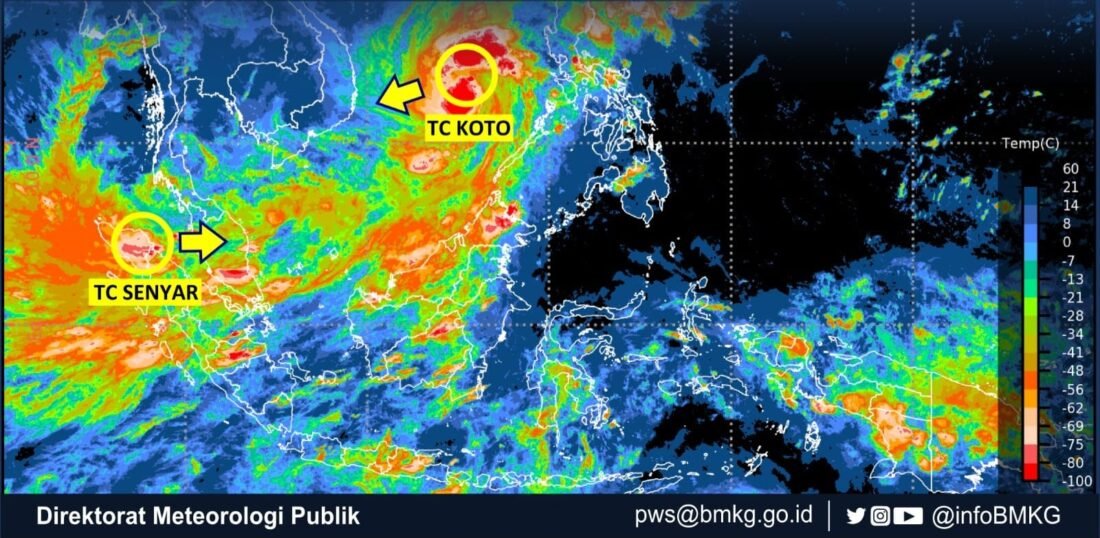 Kecepatan angin maksimum Siklon Tropis Senyar menurun dalam 24 jam dan menjadi Tropical Depression/Low dengan arah pergerakan ke arah timur menjauhi wilayah Indonesia.