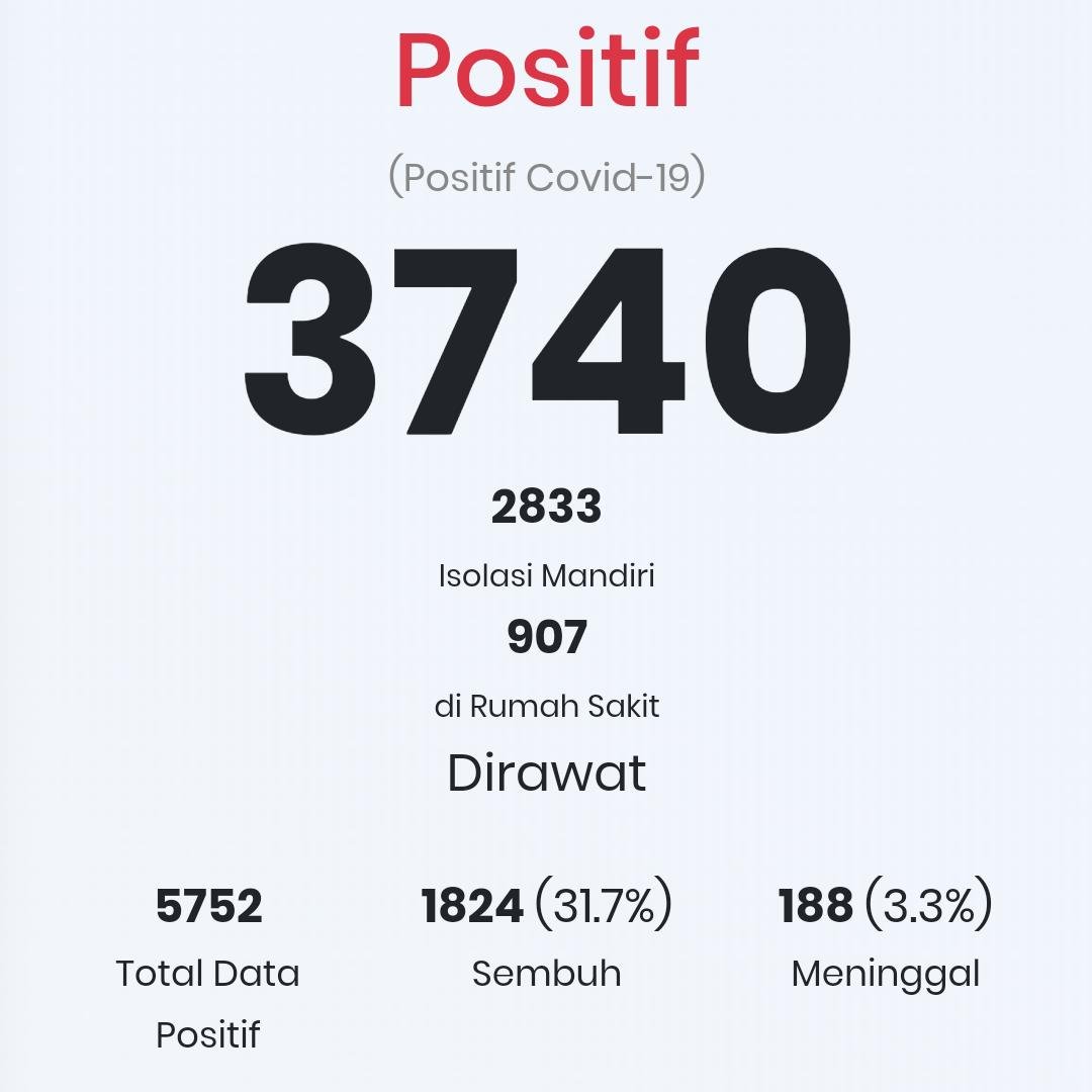 Berdasarkan situs resmi Pemerintah Provinsi (Pemprov) Sulsel, covid-19.sulselprov.go.id mencatat, saat ini pasien positif Covid-19 yang ditangani mencapai 3.740 orang. Terbagi, 2.833 menjalani isolasi mandiri dan 907 orang sedang dirawat intensif di rumah sakit rujukan penanganan Covid-19 yang di pusatkan di Kota Makassar.