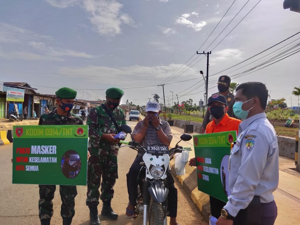 Pasi Intel Kodim 0914/TNT Kapten Inf Yoyok Dwi S menjelaskan, kegiatan kali ini dilaksanakan di Simpang Alun-Alun Stadion Mini Tideng Pale di Jalan Jenderal Sudirman. “Setiap pelanggar prokes akan diberi sanksi berupa Push Up, membacakan teks Pancasila, menyanyikan lagu Indonesia Raya, serta dilakukan pembinaan. Hal ini dilakukan untuk memberi efek jera agar tidak mengulangi lagi pelanggaran serta tetap disiplin menerapkan protokol kesehatan, khususnya penggunaan masker pada saat berada di luar rumah,” terangnya.