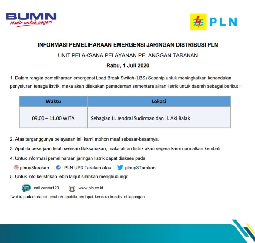 TARAKAN – disampaikan pada Rabu 1 Juli 2020 pukul 09.00-11.00 wita akan dilakukan pemadaman sementara Penyulang Tarakan 04 Zona 1 sehubungan dengan pekerjaan pemeliharaan emergensi Load Break Switch (LBS) Sesanip.
