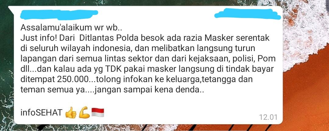 Just info! Dari Ditlantas Polda besok ada razia Masker serentak di seluruh wilayah indonesia, dan melibatkan langsung turun lapangan dari semua lintas sektor dan dari kejaksaan, polisi, Pom dll… dan kalau ada yang tidak pakai masker langsung di tindak bayar ditempat 250.000…tolong infokan ke keluarga, tetangga dan teman semua ya….jangan sampai kena denda.