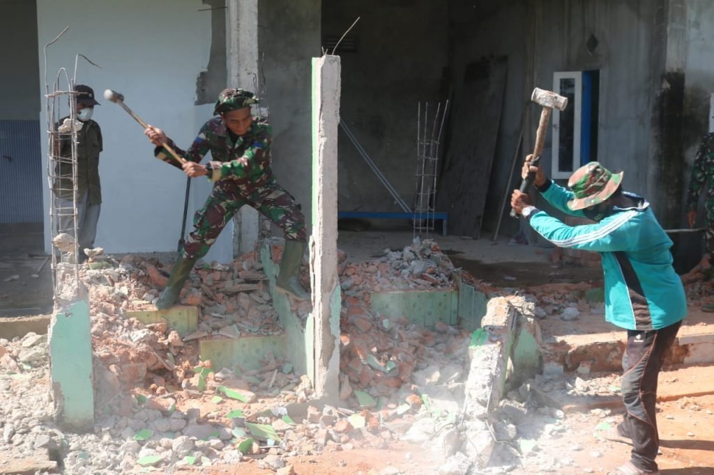 TARAKAN – Kegiatan TNI Manunggal Membangun Desa (TMMD) ke-109 Kodim 0907/Trk tetap berlanjut. Meski kebanyakan orang tengah bersantai menghabiskan hari libur akhir pekan untuk berkumpul bersama keluarga, namun cara berbeda ditunjukkan Personel Satgas TMMD bersama warga yang kompak dan penuh semangat merobohkan dinding tempat wudhu bangunan lama dari masjid An – Nur di RT 16, Kelurahan Karang Harapan, untuk dibenahi sebagai wujud pengabdian terhadap negeri, salah satunya melalui renovasi rumah ibadah, Ahad (27/09/2020).