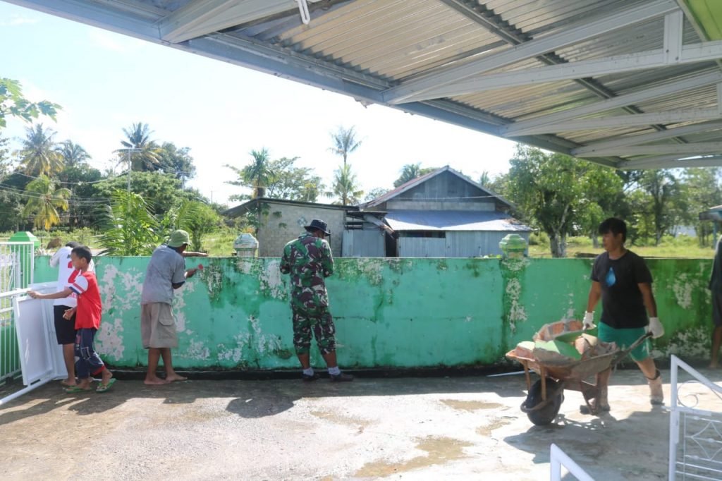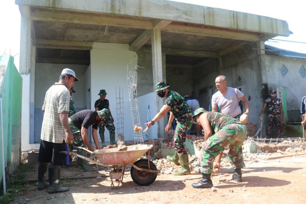 Meski sinar matahari terpantau cukup terik siang tadi, pengerjaan secara gotong-royong yang dilakukan oleh Satgas TMMD bersama masyarakat tetap berjalan aman dan lancar. Tampak pula suasana saling membagi tugas antara warga dan personel Satgas berseragam loreng khas TNI membuang pecahan beton dari reruntuhan dinding hijau muda, usai dihujamkan palu untuk dibersihkan kembali agar masjid terlihat rapi.