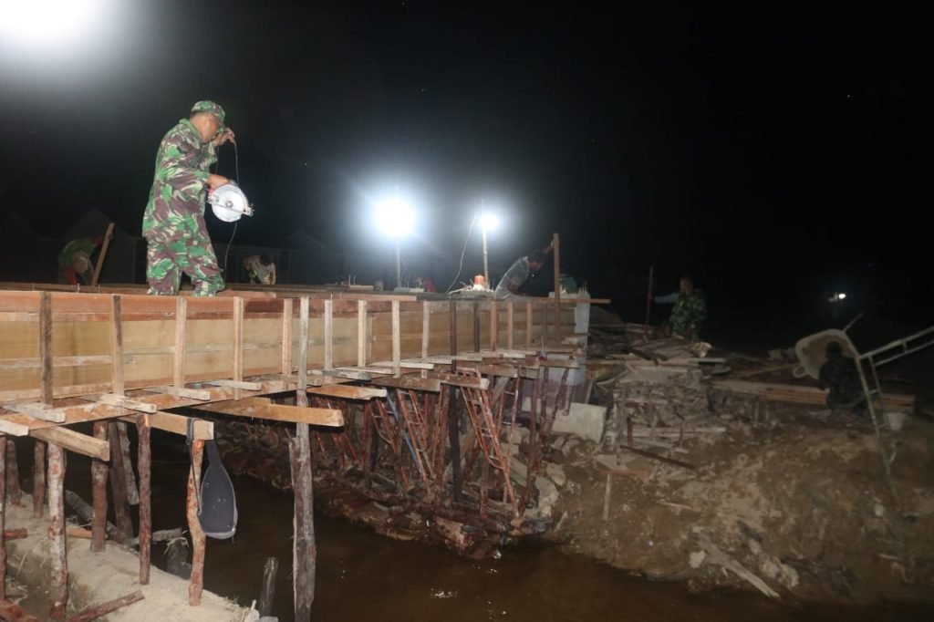 Hal ini tampak ketika Satgas TMMD bersama masyarakat mengebut pengerjaan Jembatan Penunjang Jalan Penghubung meski harus lembur pada malam hari, Senin (12/10/2020).