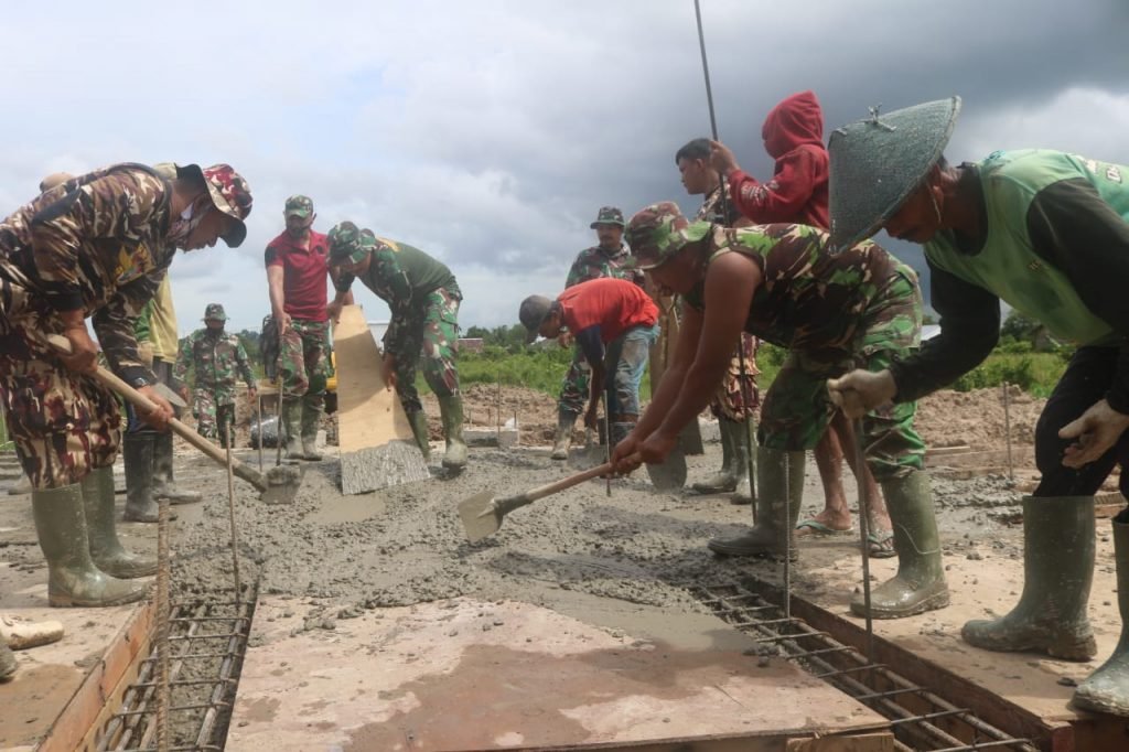 TARAKAN – Meninjau kegiatan TMMD ke-109. Dansatgas, Letkol Inf. Eko Antoni Chandra Lestianto untuk memastikan segala komposisi dan bahan yang digunakan dalam pengerjaan fisik di sasaran utama pembangunan jembatan berjalan sesuai standarisasi dari konsultan Dinas Pekerja Umum Kota Tarakan.