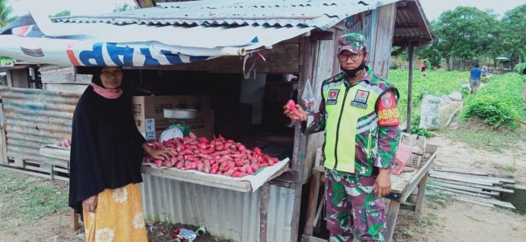 Anggota Babinsa Koramil 0907/04 Tarut Serka Sugianto membantu panen ubi jalar di kebun milik Hamid (56) warga RT. 18 Kel. Juata Laut, Senin (22/02/2021).