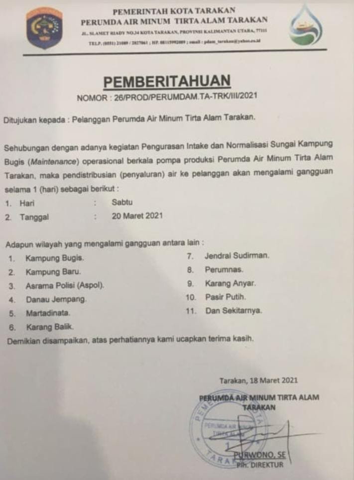 TARAKAN – Pelanggan Perumda Air Minum Tirta Alam (PDAM) Tarakan diharuskan untuk bersabar selama satu hari, karena akan mengalami gangguan penyaluran air pada Sabtu (20/3/2021)