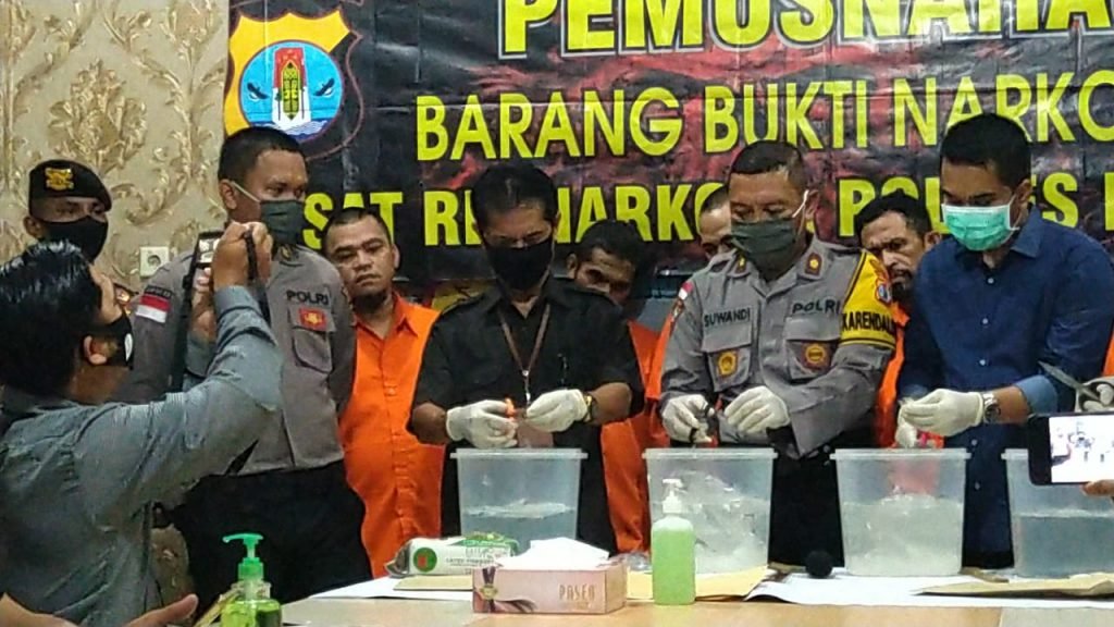 NUNUKAN – Di tengah wabah Covid-19, peredaran narkotika seperti tidak ada hentinya di Indonesia, khususnya di Kabupaten Nunukan. Hal itu terbukti dengan pengungkapan oleh Satuan Reskoba Polres Nunukan sejak bulan April hingga Mei 2020, yakni barang bukti (BB) sebanyak 2.397,89 gram atau 2,3 kilogram (kg) narkotika jenis sabu-sabu. Barang bukti itu pun dimusnahkan di Mako Polres Nunukan, Jumat 15 Mei 2020, sekitar pukul 10.00 Wita tadi dengan cara dilarutkan ke dalam air.