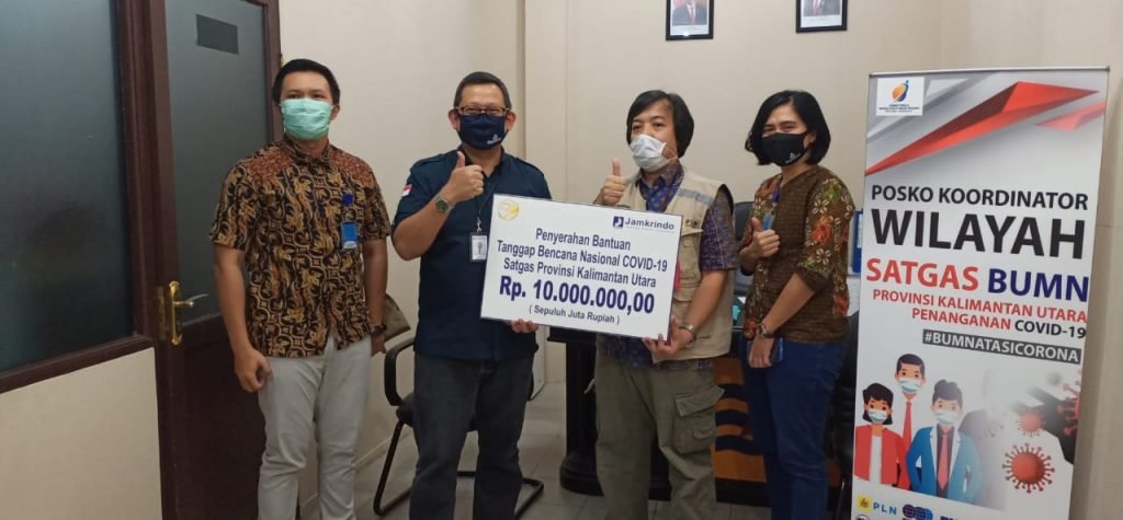 TARAKAN – Dalam masa bencana Non-Alam Pandemi Covid-19, Kamis 14 Mei 2020 PT. Jamkrindo Cabang Tarakan yang tergabung dalam Satgas BUMN memberikan bantuan berupa uang tunai Rp 10 juta melalui PLN selaku Ketua Kordinator Wilayah Satgas BUMN Covid-19 Provinsi Kalimantan Utara di Posko Covid-19 Tarakan.