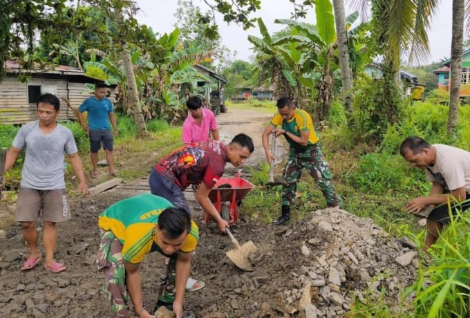 Gotong Royong TNI dan Warga Perbaiki Jalan Desa di Kecamatan Lumbis