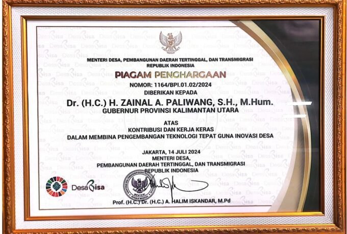 Dinilai Tangguh dalam Pengembangan Inovasi TTG, Gubernur Kaltara Raih Piagam dan Lencana Abdi Inovasi Desa dari Kemendes PDTT